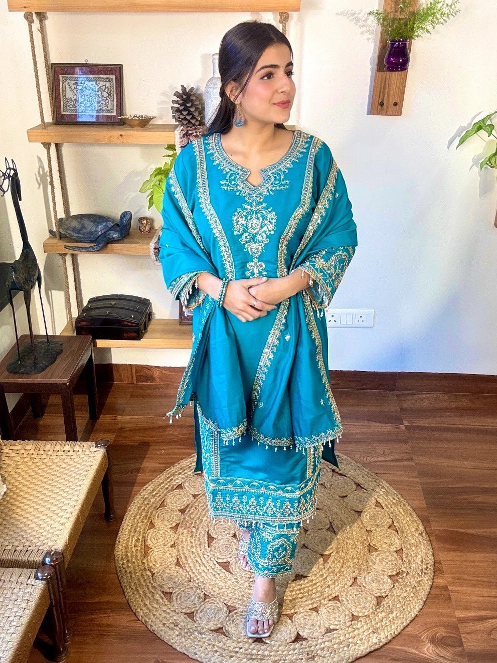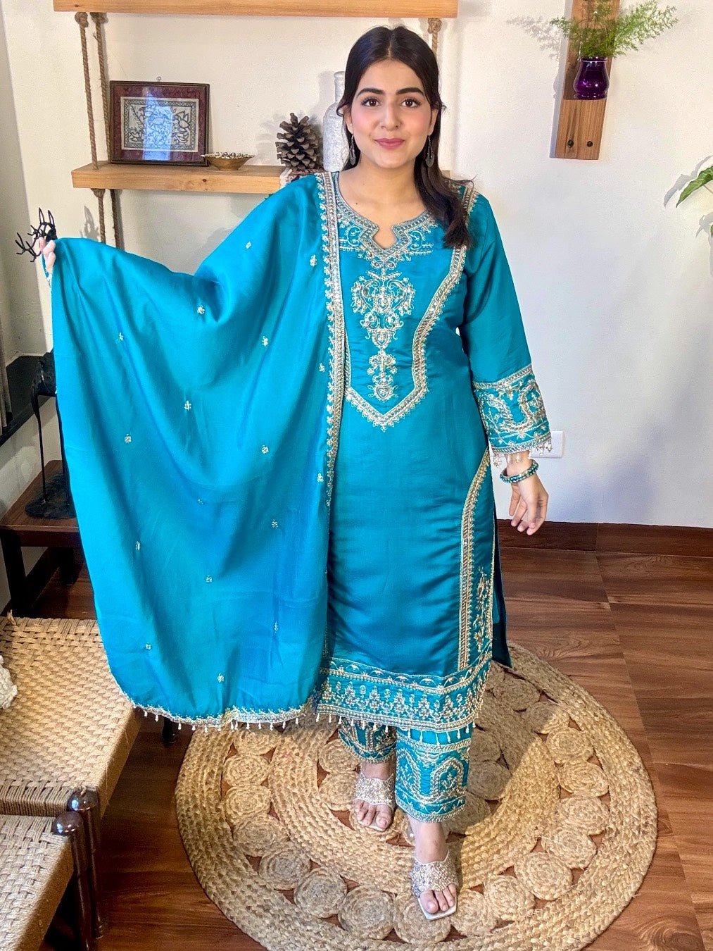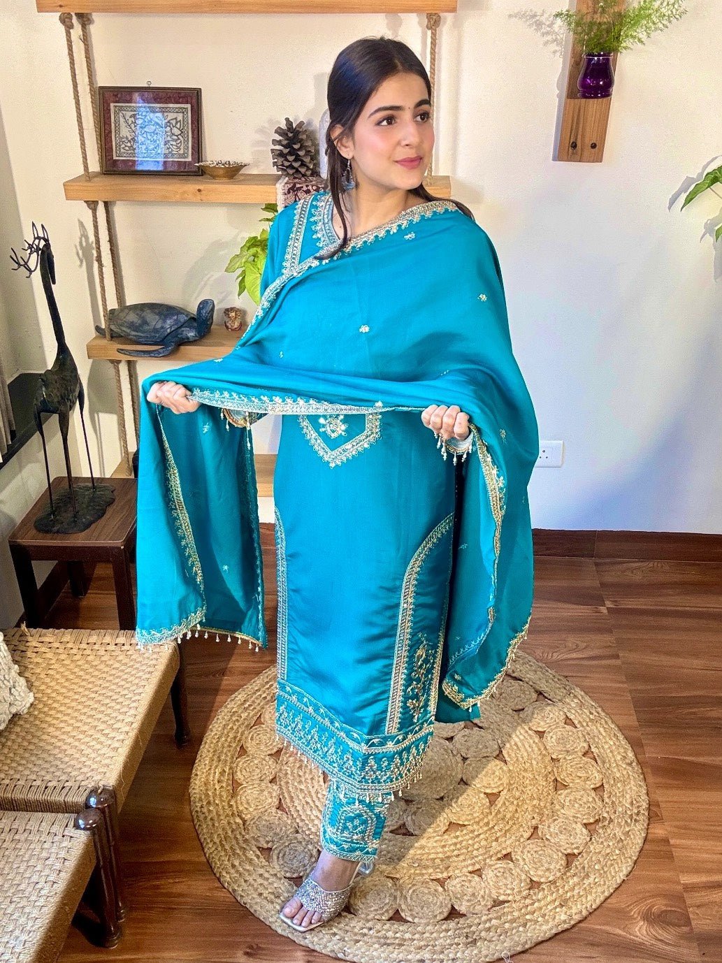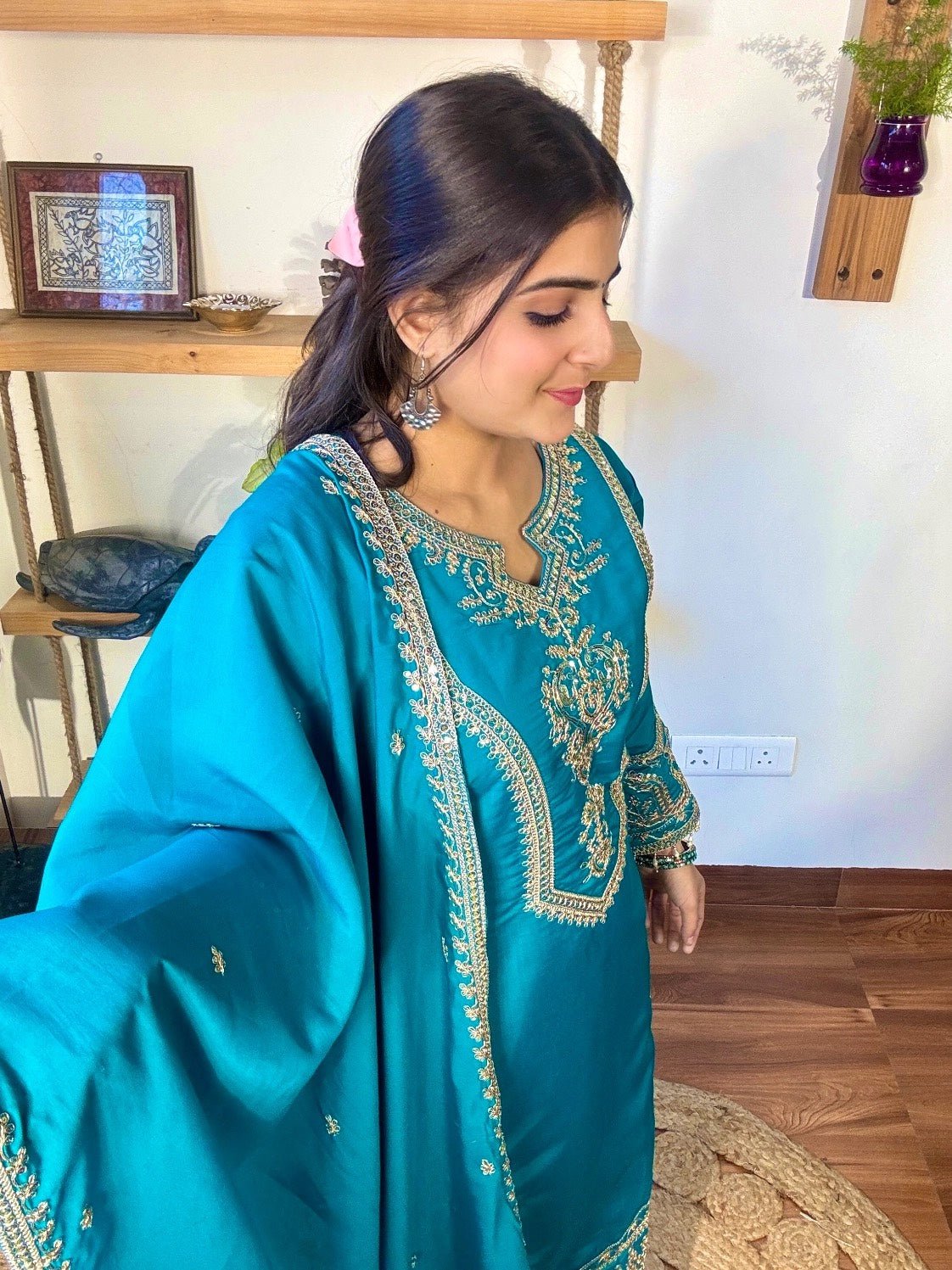 • Pants: Embellished with delicate Zari work on the border, seamlessly complementing the kurta.